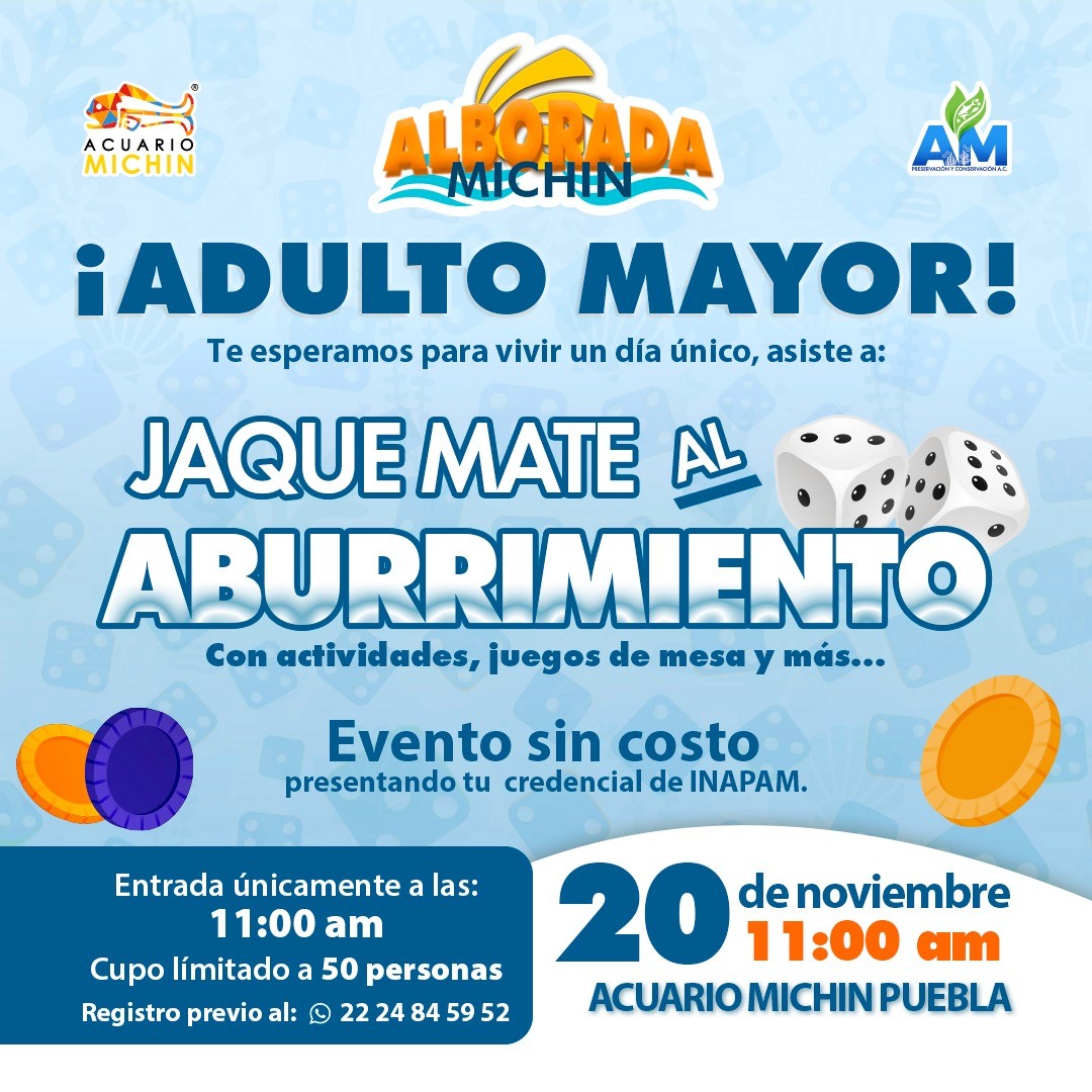 “JACQUE MATE al Aburrimiento. Con actividades, juegos de mesa y más…” 20 de noviembre, 11:00 am en Acuario Michin Puebla. Registro al: 2224845952. Actividad gratuita presentando tu credencial INAPAM.