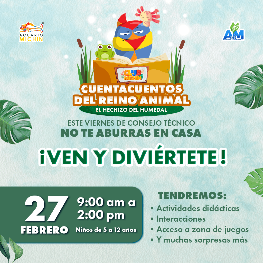 “Cuenta cuentos del reino animal” 27 de febrero, 9:00 am a 2:00 pm en Acuario Michin Puebla. Registro al: 2224845952.