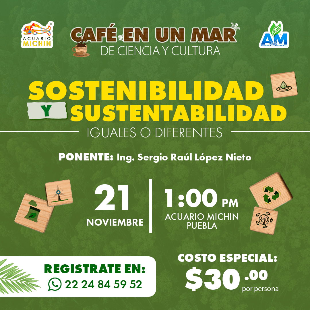“Sustentabilidad o sostenibilidad” 21 de noviembre, 13:00 hrs en Acuario Michin Puebla. Registro al: 2224845952. Costo: $30.00 pesos